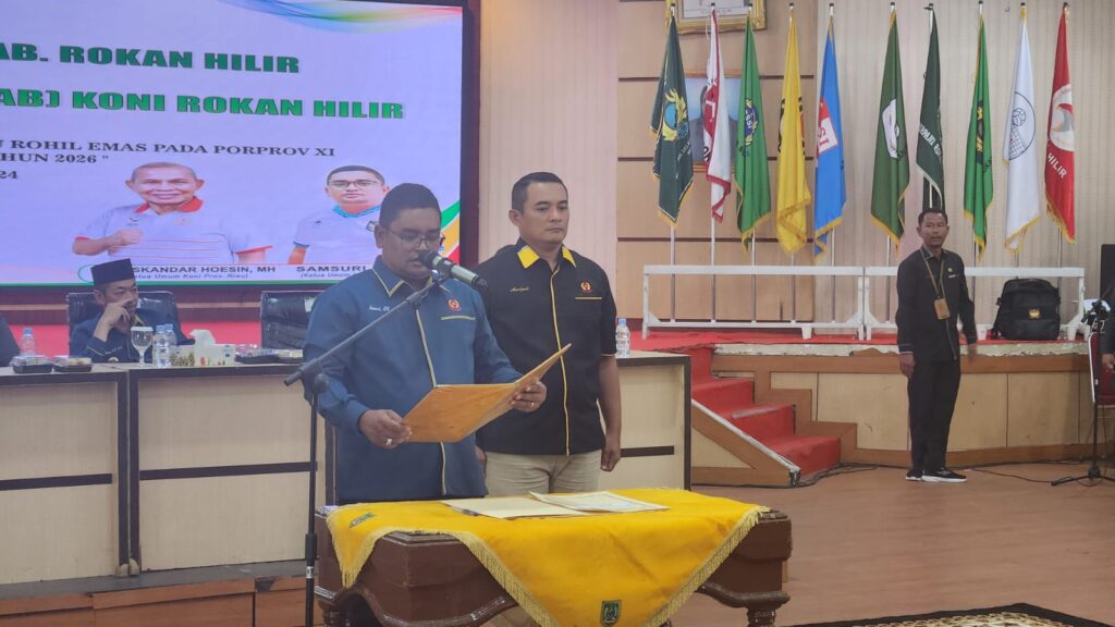 Bagansiapiapi,RIau Bangkit – Bupati Rokan Hilir (Rohil) Afrizal Sintong hadiri pelantikan Koorcam Koni se-kabupaten Rohil dan Rapat Kerja Kabupaten (Rakerkab) KONI tahun 2024, Jumat (16/8/2024).