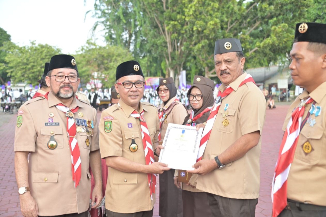 riau-bangkit.com | BENGKALIS – Usai melaksanakan upacara Peringatan Hari Pramuka ke-63, Sekretaris Daerah Kabupaten Bengkalis dr. Ersan Saputra TH menyerahkan sekaligus menyematkan tanda Penghargaan Gerakan Pramuka Kwartir Cabang Gerakan Pramuka Tahun 2024, di Lapangan Tugu Bengkalis, Minggu (18/8/2024).