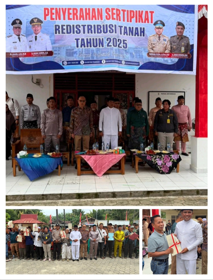 ​Pangkalan Gondai, Pelalawan RBC – Bupati Pelalawan, H. Zukri, SM, MM, secara langsung menyerahkan 236 sertifikat Program Redistribusi Tanah kepada masyarakat di Desa Pangkalan Gondai, Kecamatan Langgam, pada hari Jumat, 28 November 2025. Penyerahan sertifikat ini menjadi tonggak penting dalam memberikan kepastian hukum atas kepemilikan tanah sekaligus aset untuk menunjang peningkatan kesejahteraan ekonomi masyarakat.