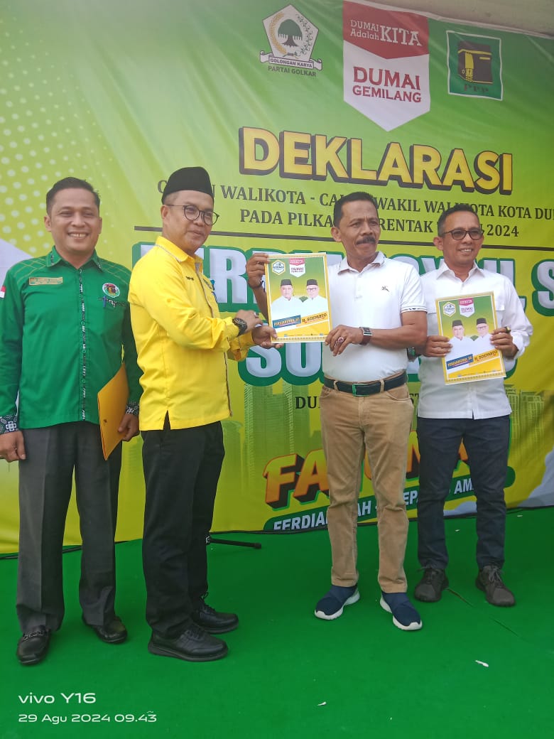 “Berdasarkan Surat Keputusan Partai Golkar Nomor: SKEP-171/DPP/GOLKAR/VIII/2024 dan Surat Keputusan Partai Persatuan Pembangunan Nomor: 3264/KPTS/DPP/VIII/2024, kami mendeklarasikan diri mendukung sepenuh hati, bergotong royong memperjuangkan dan memenangkan pasangan Ferdiansyah, S.E. dan Soeparto sebagai Walikota dan Wakil Walikota Dumai periode 2024-2029,” demikian pernyataan deklarasi yang disampaikan dengan penuh semangat oleh ketua Koalisi Edison, S.H.