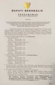 Informasi tentang penyediaan bantuan biaya siswa pendidikan bagi mahasiswa berdasarkan pengumuman nomor 400.3.1/360/Kesra/2024. Sedangkan informasi tentang penyediaan beasiswa khusus tahfidz quran Kabupaten Bengkalis berdasarkan pengumuman nomor 400.3.1/361/Kesra/2024, yang ditandatangani Bupati Bengkalis Kasmarni, tanggal 16 Agustus 2024.